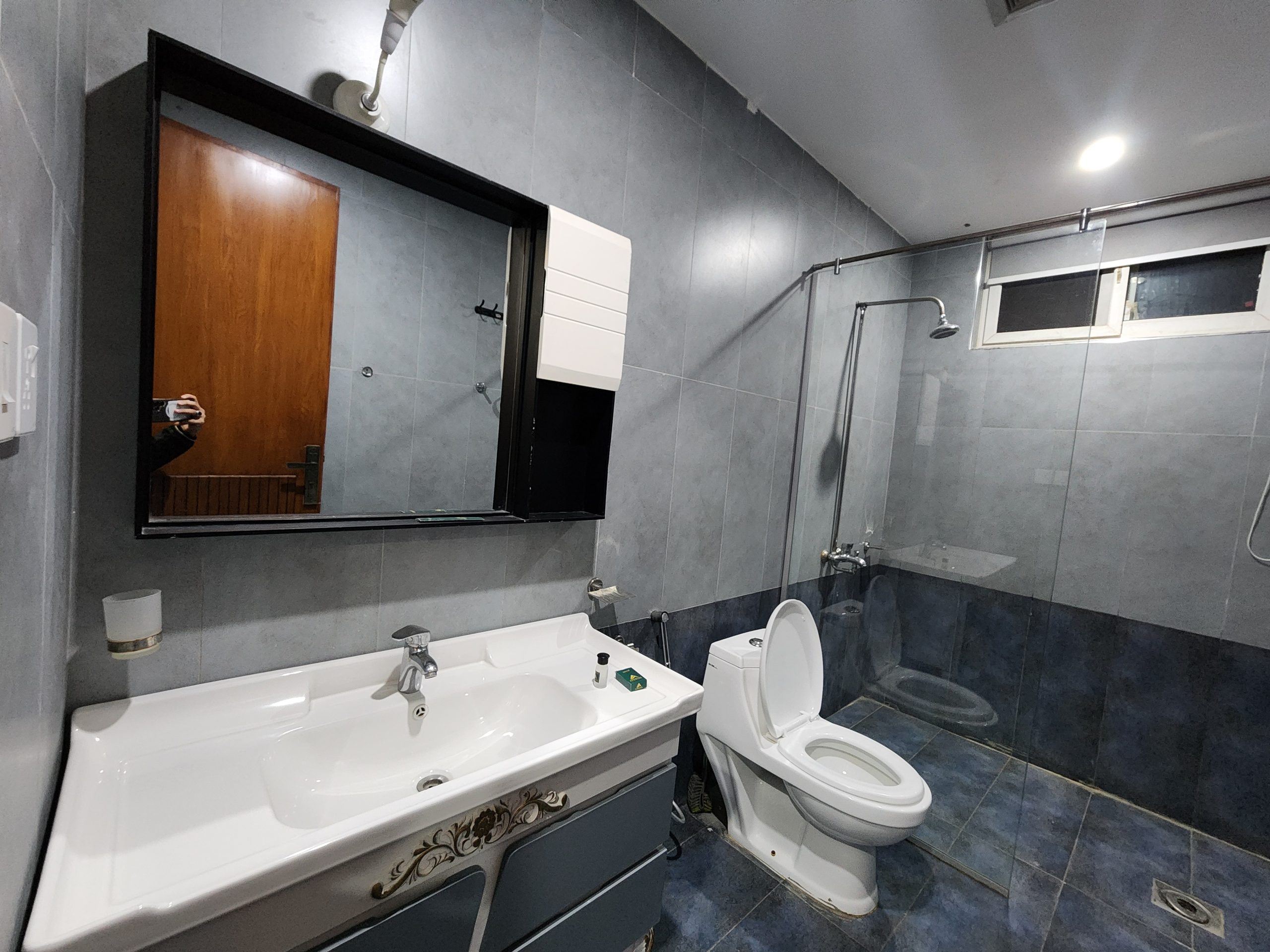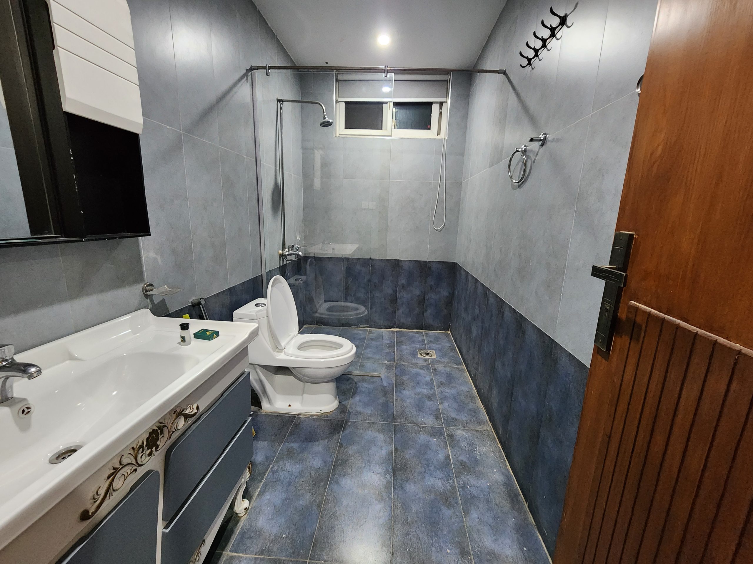Bathroom: Modern bathroom with a spacious shower and toiletries including towel, soap, comb, shampoo, and tissue box.